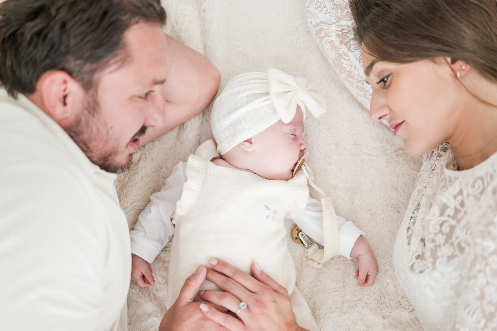 Le studio photo offre quant à lui une approche plus épurée. Dans un espace lumineux, chaleureux et volontairement sobre, les images se concentrent sur l’essentiel : votre bébé, votre famille, vos liens. C’est une alternative idéale si vous souhaitez des portraits intemporels.